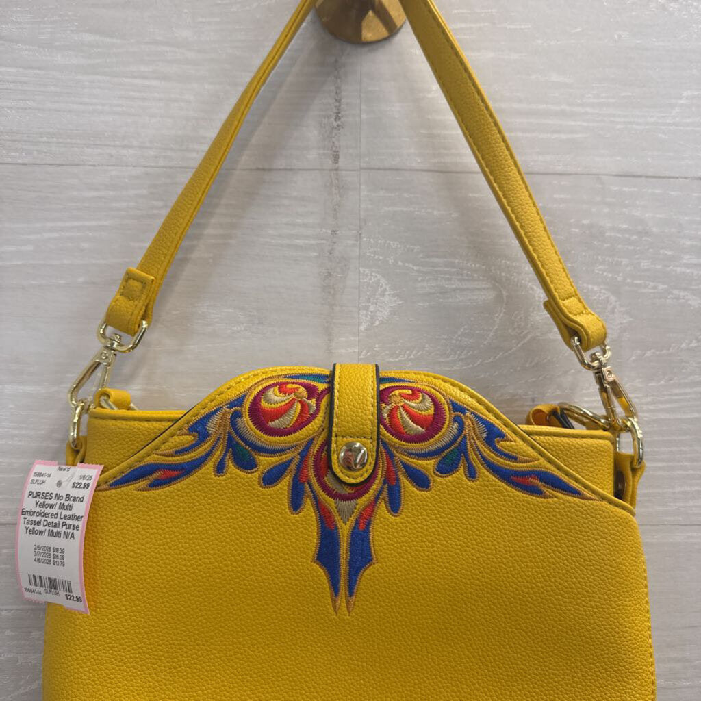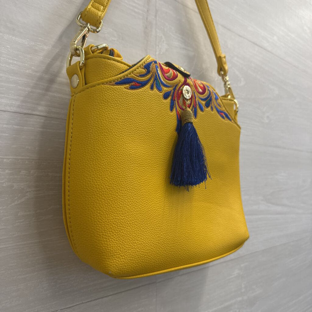 Yellow/ Multi Embroidered Leather Tassel Detail Purse