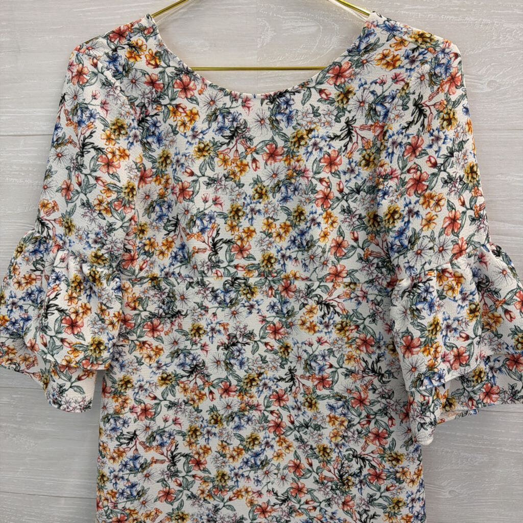 Zara White/ Multi Flower Print Bell Sleeve Dress Extra Small